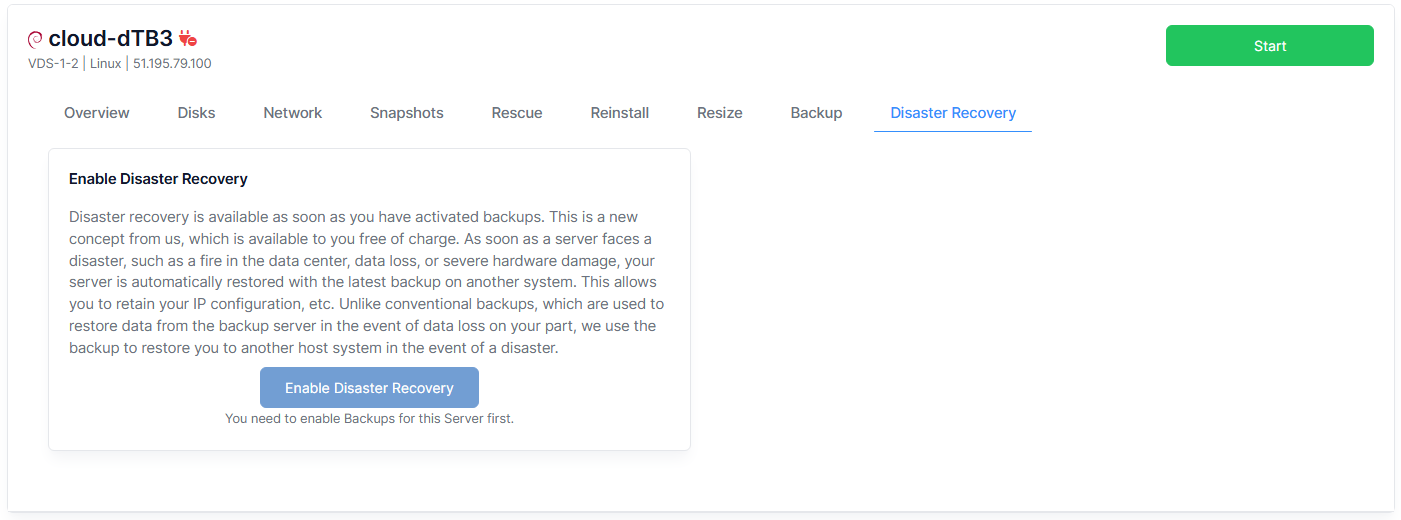 Disaster Recovery is an advanced safeguard available to customers who have enabled backups. While backups alone ensure that data is preserved, Disaster Recovery goes further by minimizing downtime. In the event of a disaster scenario, such as hardware failure or datacenter outage, your cloud server is automatically restored to a compatible host system using the most recent backup. This means your services are brought back online quickly, often in the same location, though in cases of larger incidents such as a datacenter-wide failure, migration to another location may be necessary to maintain continuity.