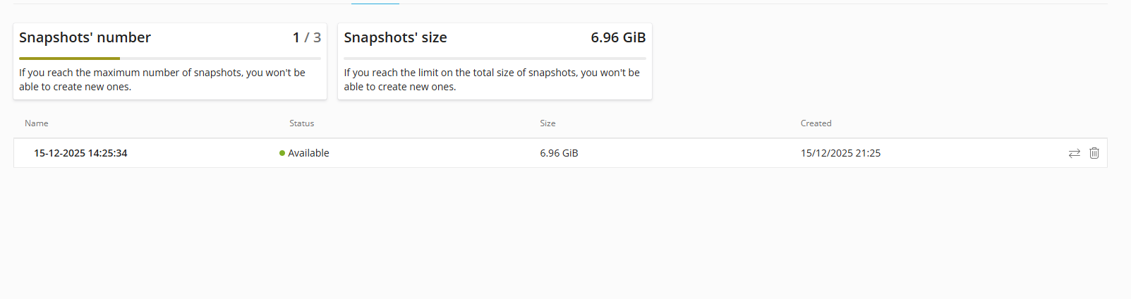 These snapshots are stored directly on the same system your server is running on. This ensures fast access and seamless integration with your environment, giving you convenience and control without additional complexity.